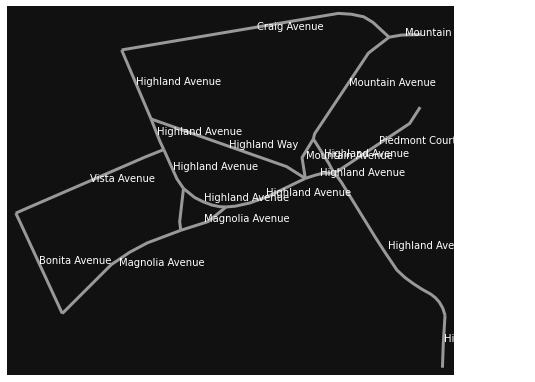 Here we label each street segment with its name. Similar logic would apply to labeling nodes instead.