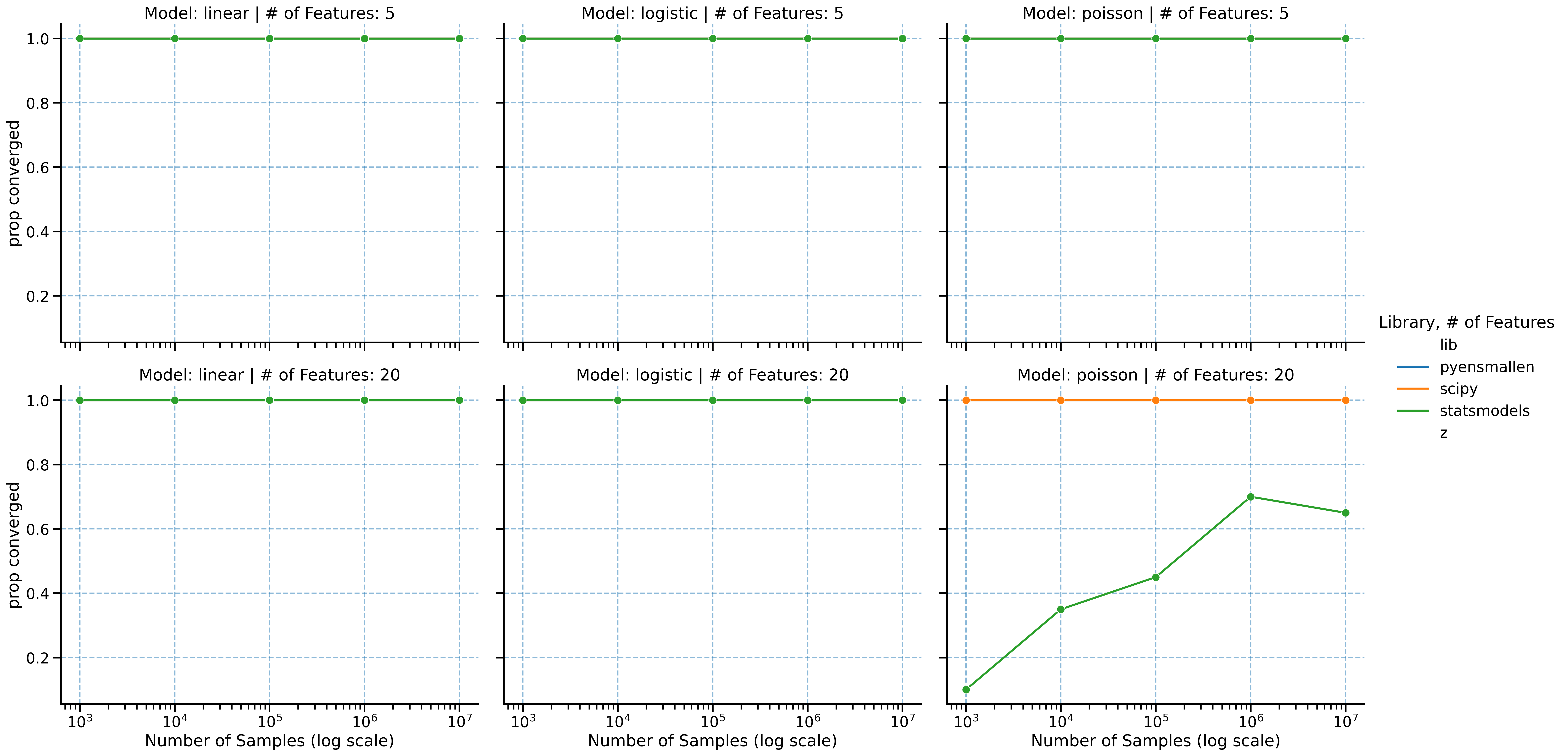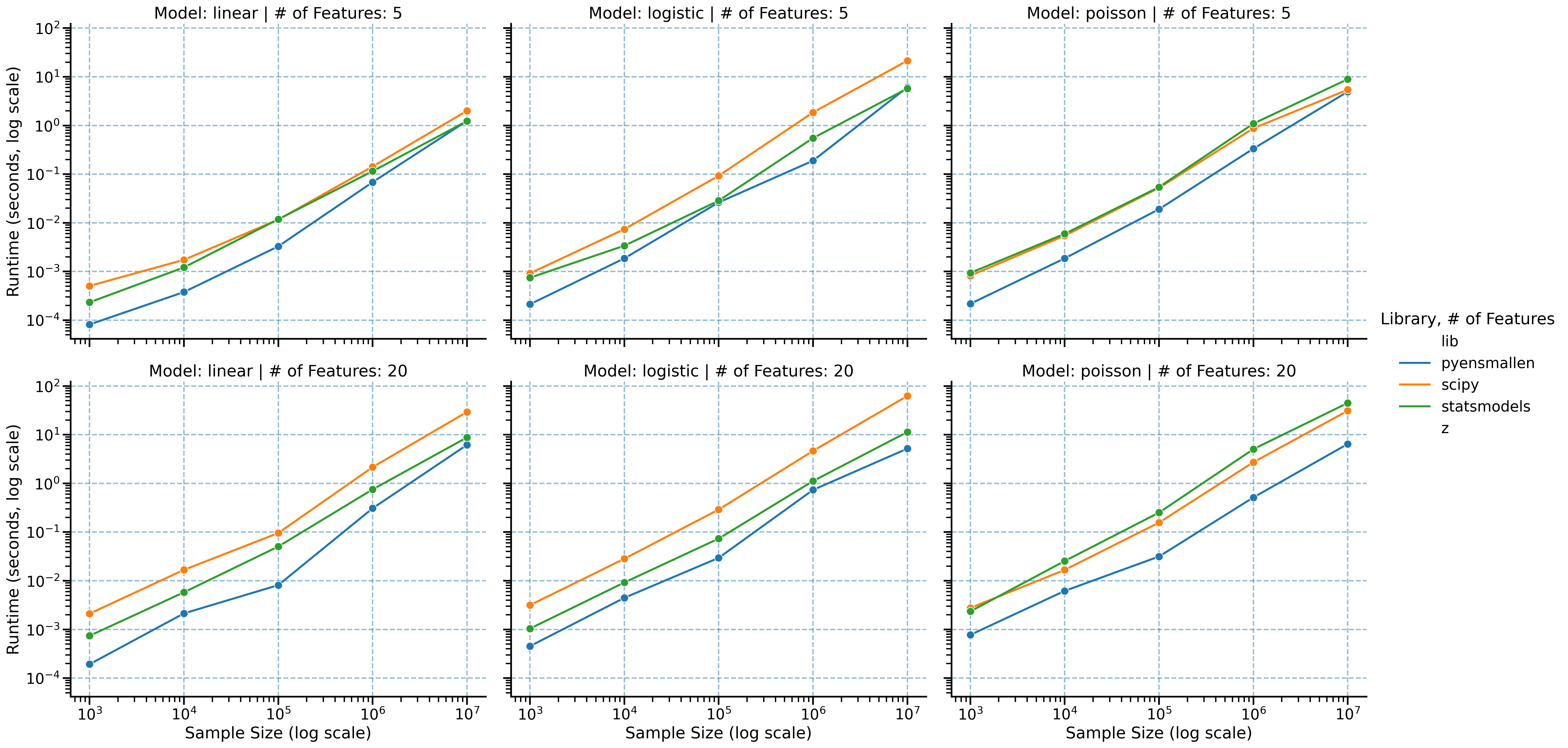 Across linear, logistic, and Poisson regression, the basic pattern is consistent: as the problem gets larger, pyensmallen tends to pull away from SciPy and statsmodels rather than merely keeping pace.