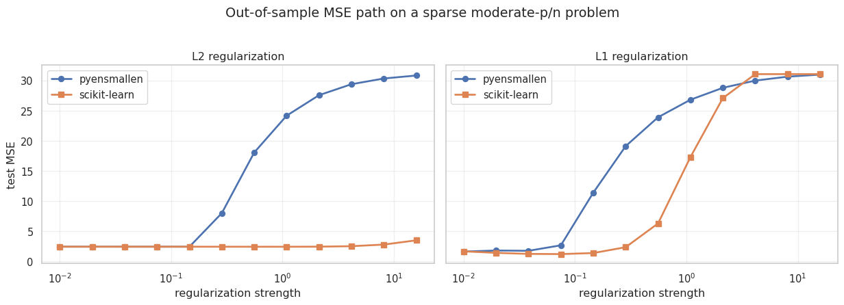 pproblem, the L1 path is much more competitive than the L2 path, which is what we would expect. - The MSE curves have the same broad shape as the scikit-learn baselines, even though the two libraries do not use identical regularization parameterizations.